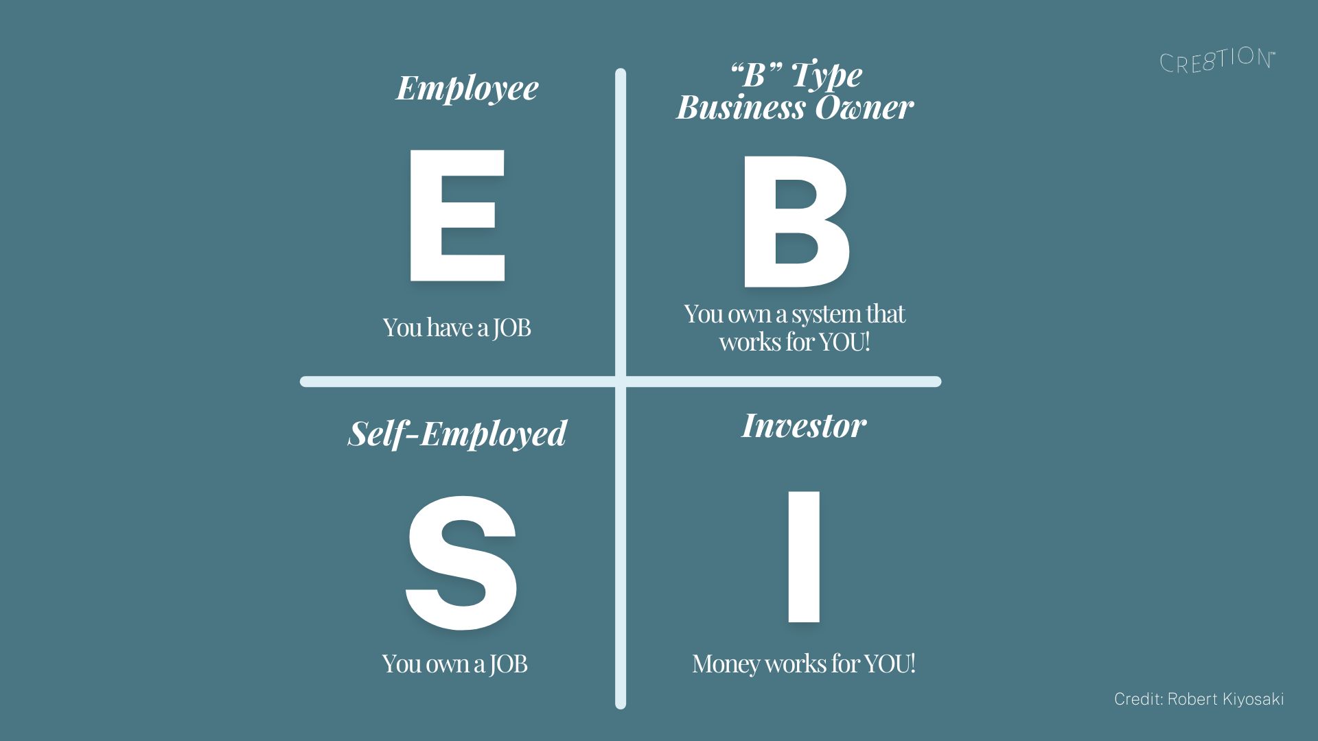 A framework by Robert Kiyosaki that explains four ways people earn money: Employee, Self-Employed, Business Owner, and Investor.